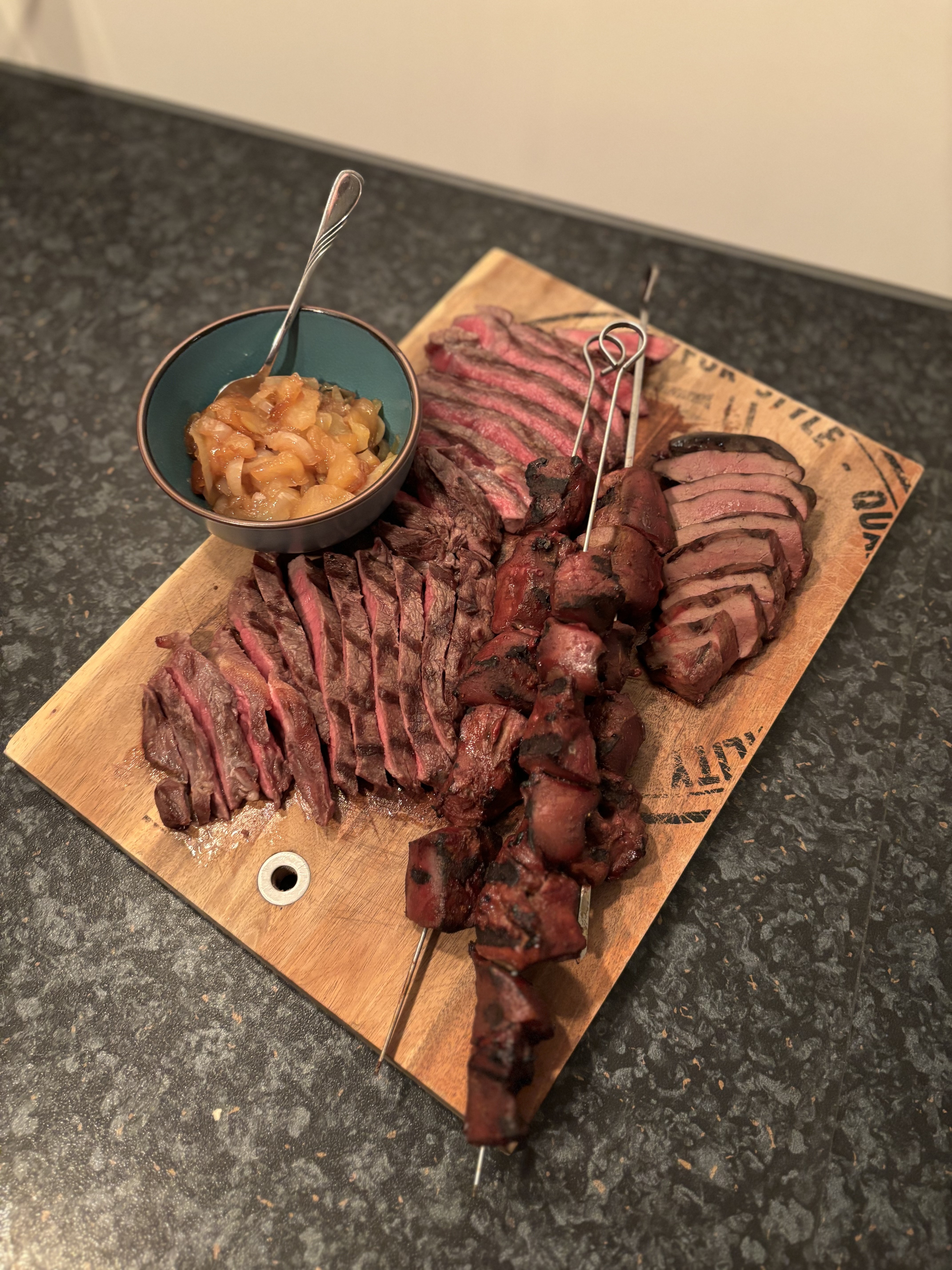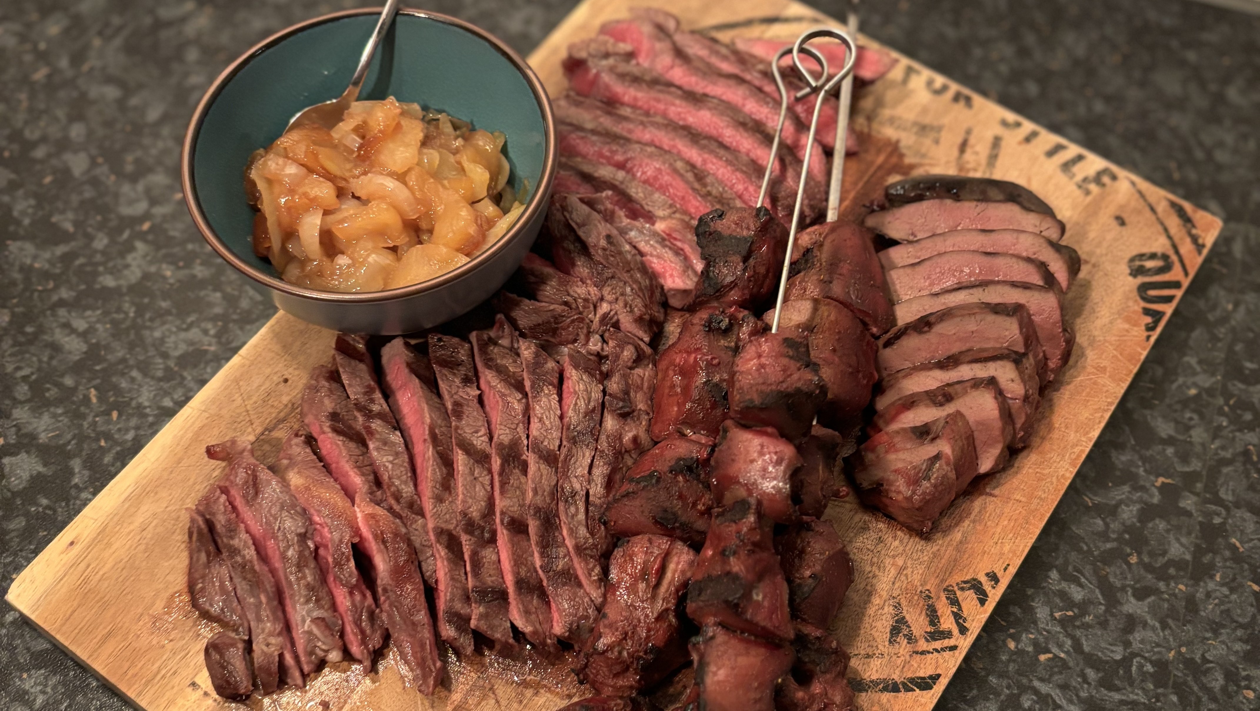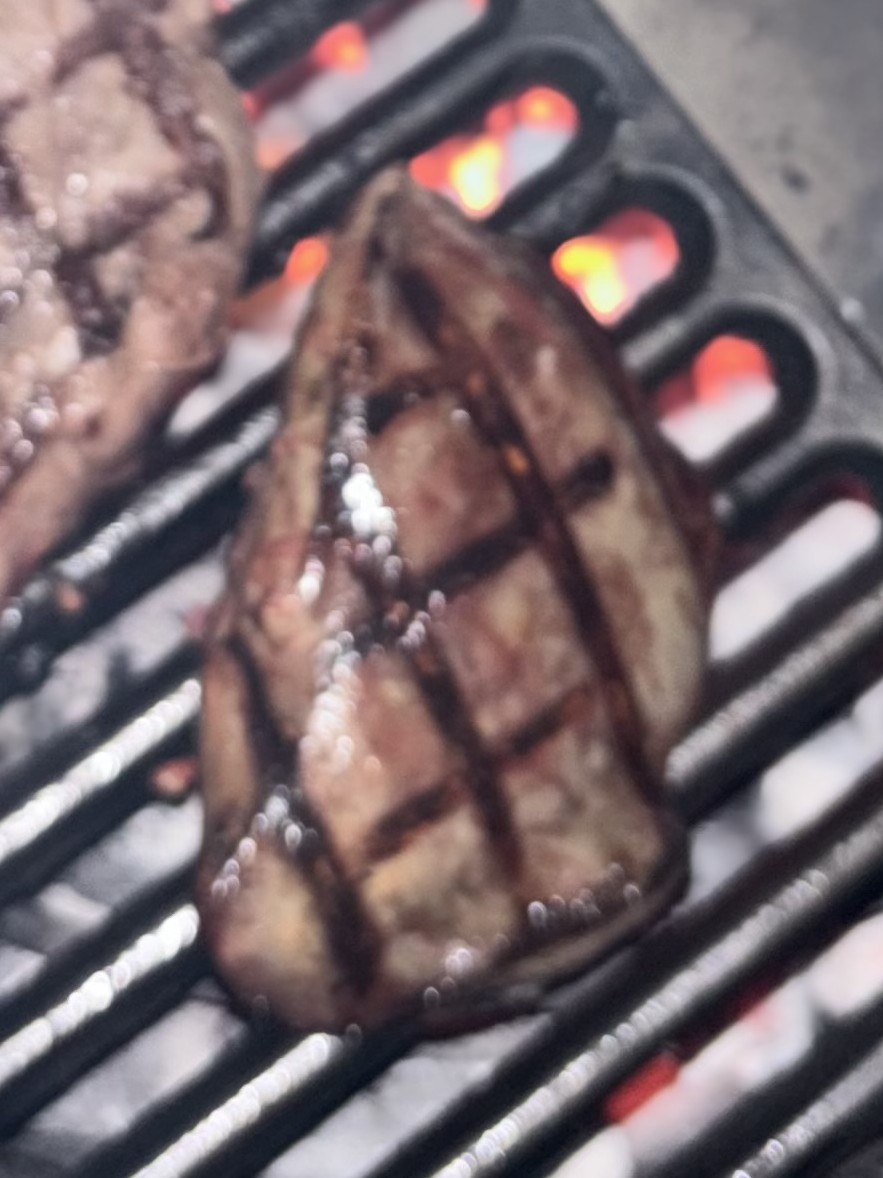 NB. Links op de foto liggen nog wat rosé gegrilde bieflappen van Schotse Hooglander