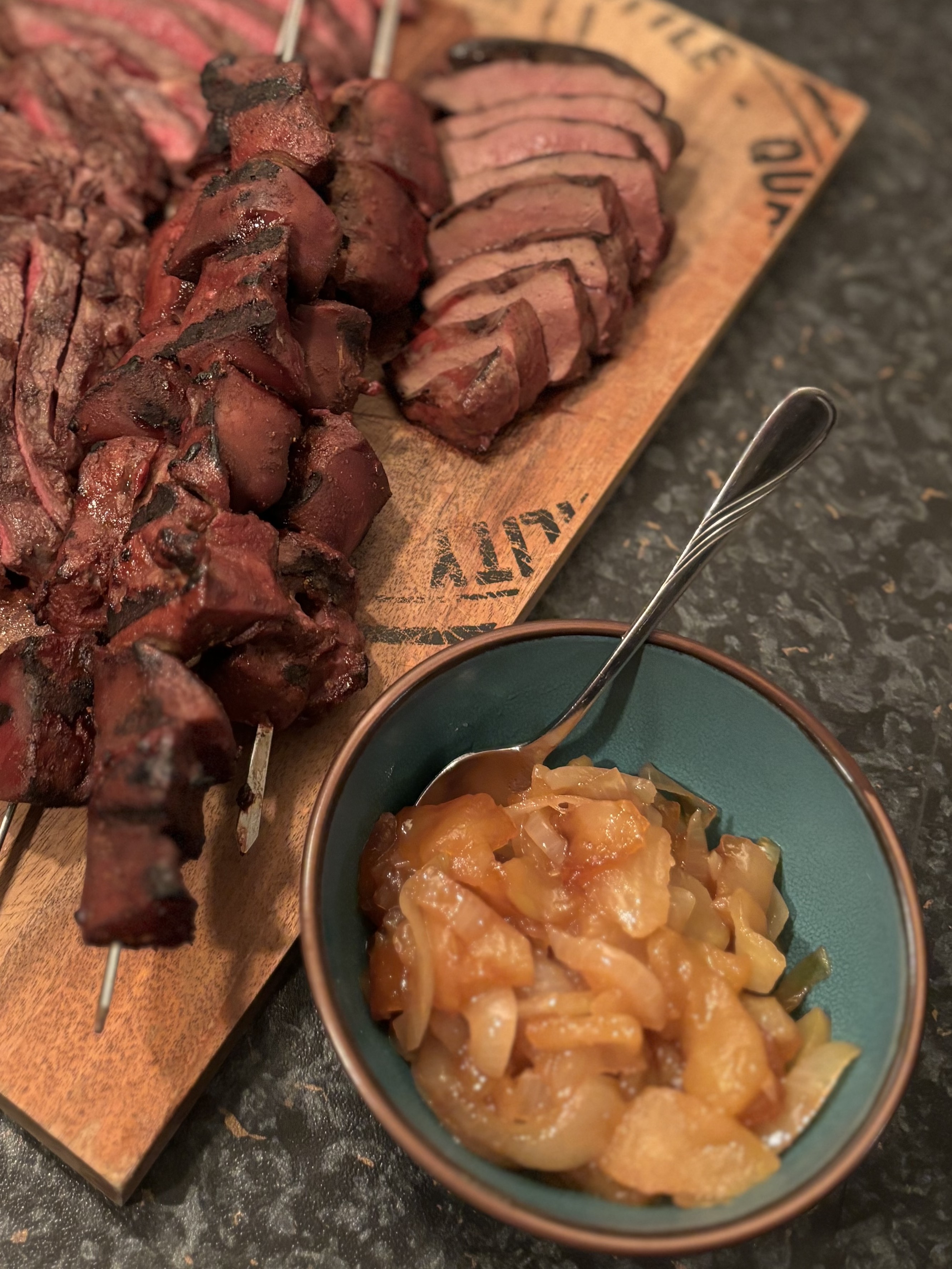 - Schik de gegrilde lever en de appel-ui-compote op een bord.