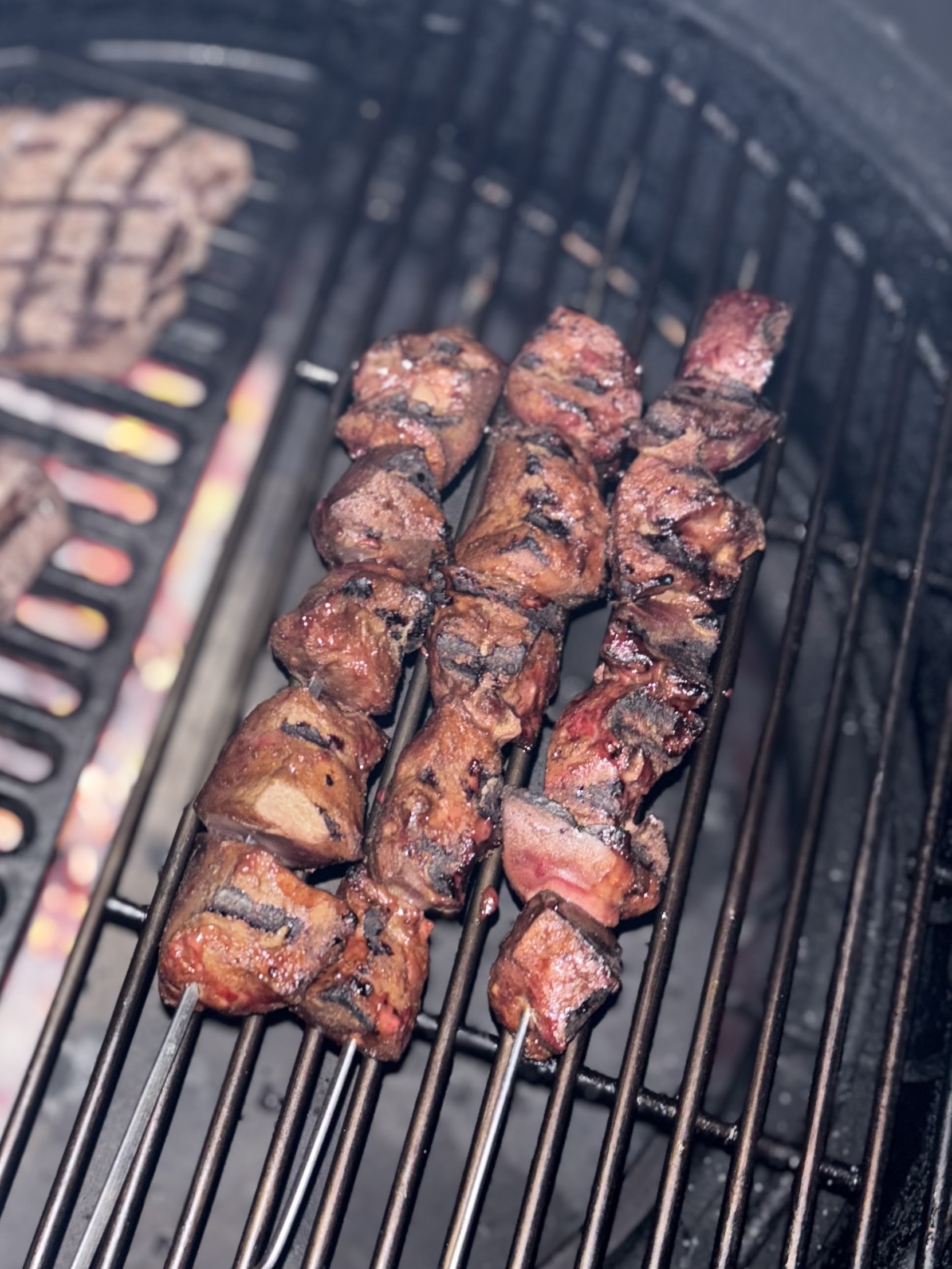 - Rijg de gemarineerde lever aan prikkers en grill of bak op hoog vuur, ongeveer 1 minuut per kant, zodat de buitenkant karamelliseert terwijl de binnenkant mals blijft.