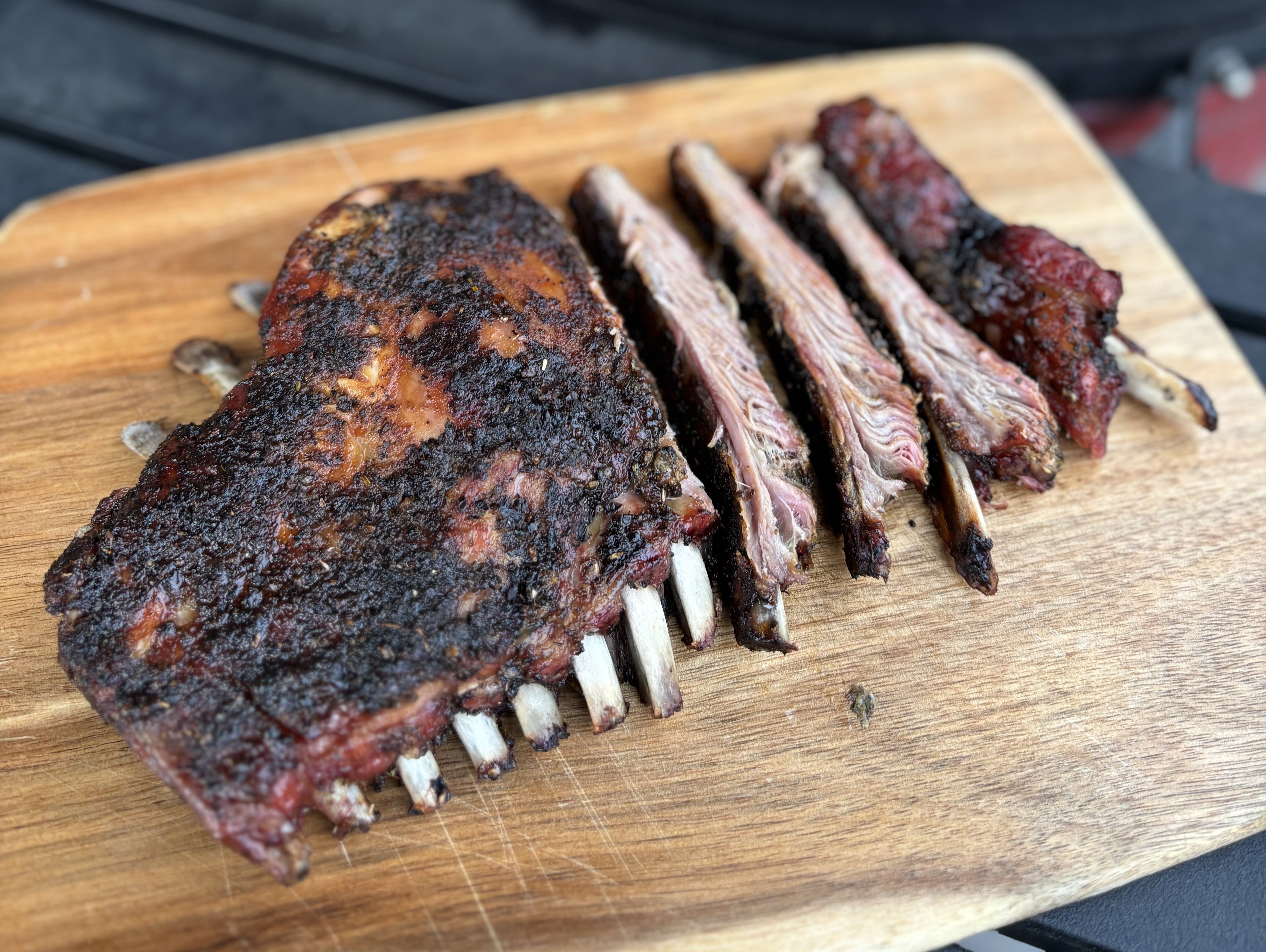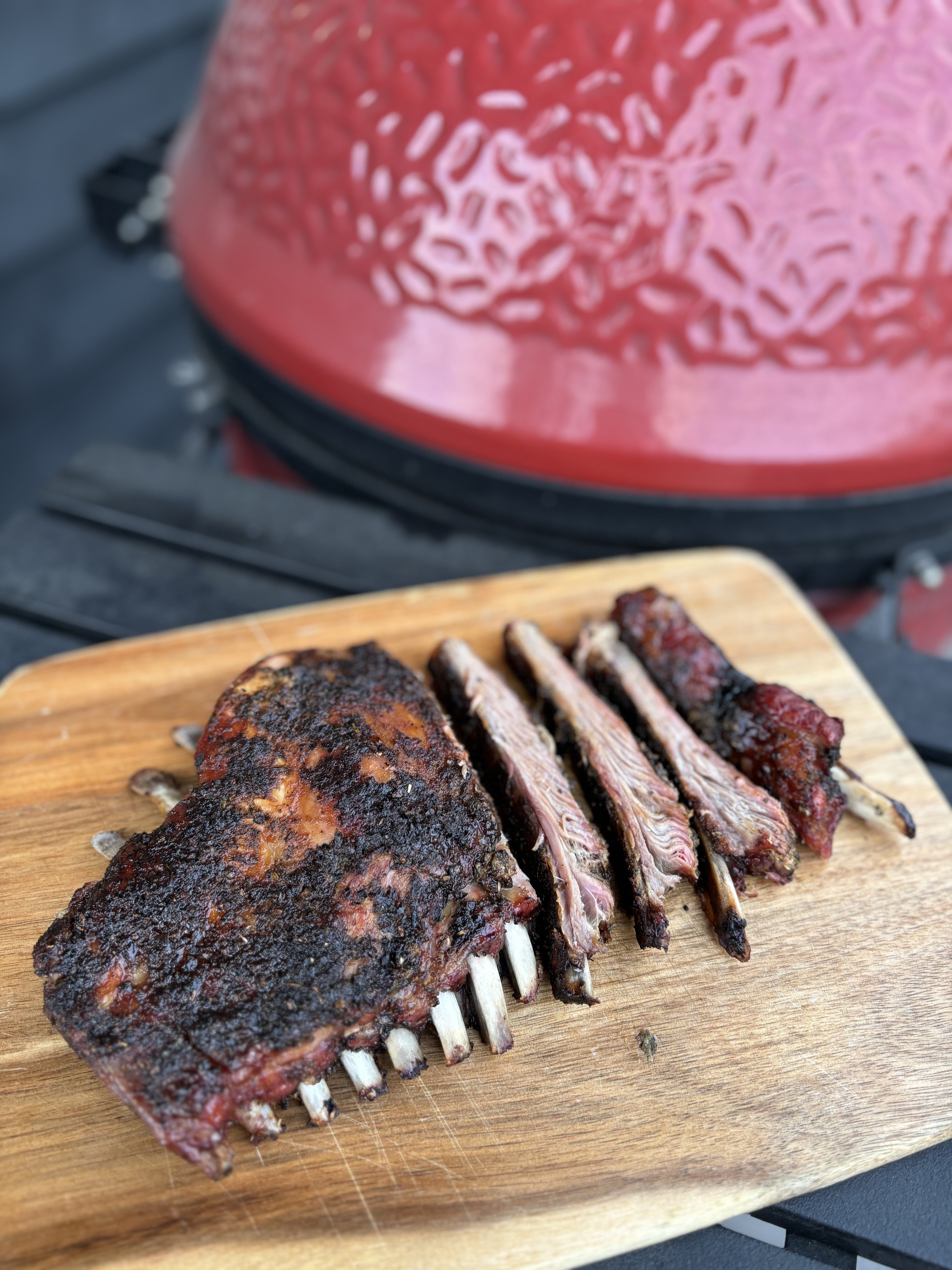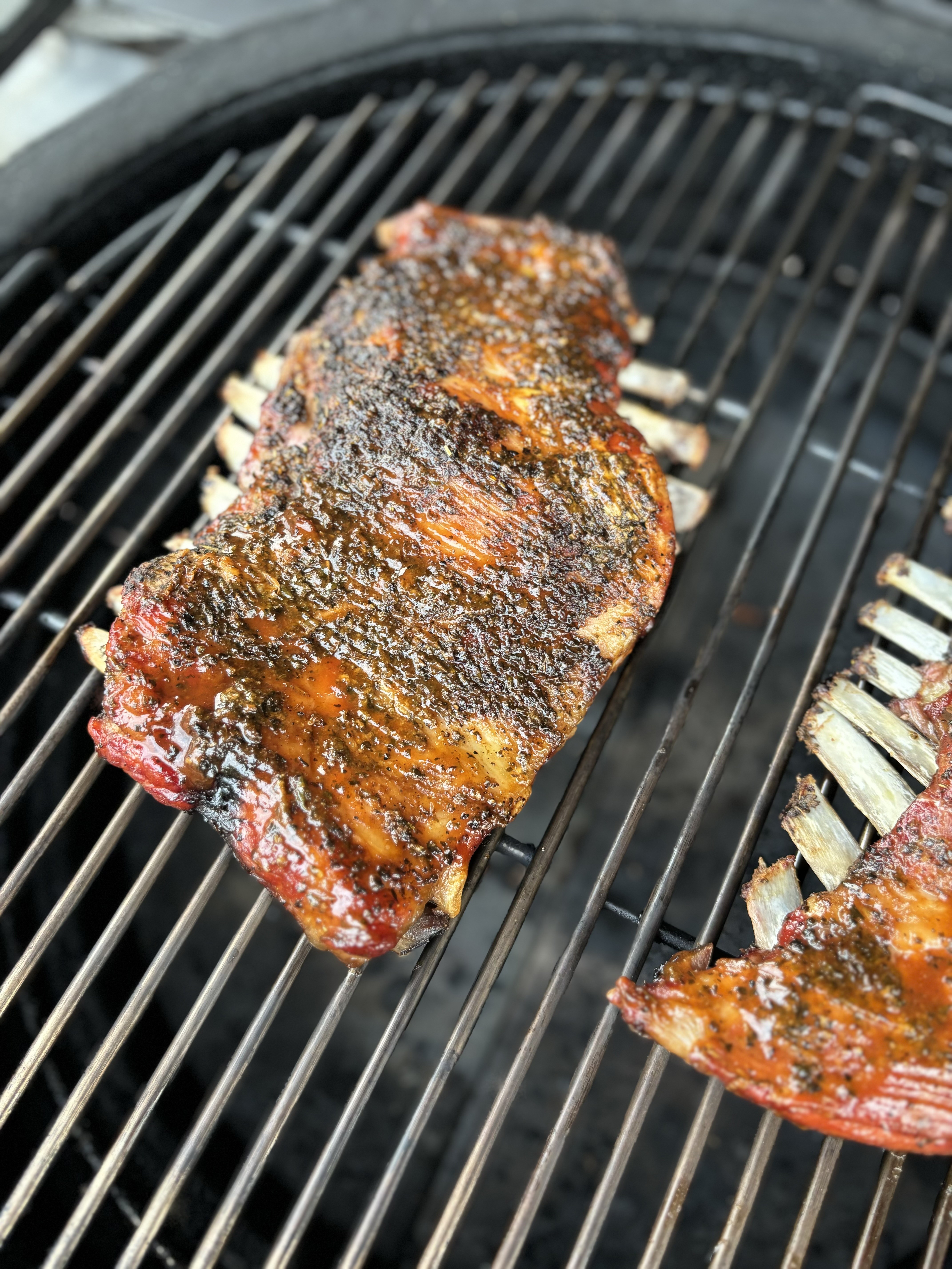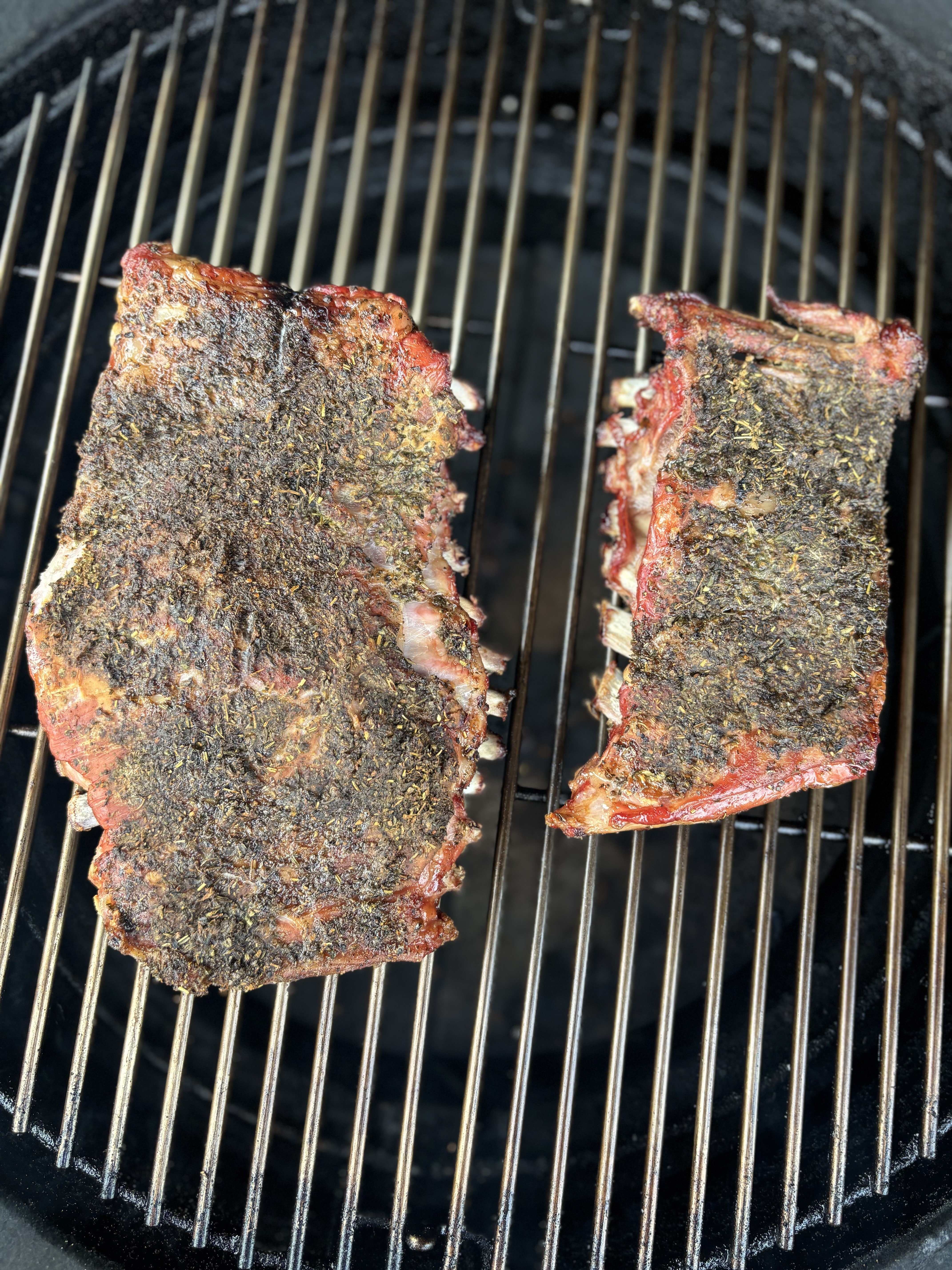- Roken: bereid de Kamado Joe of een vergelijkbare smoker voor op indirect grillen bij een temperatuur van 110–120°C. Voeg een handvol perenhout toe om een lichte rook te genereren. Rook de ribs gedurende 2 uur met gesloten deksel.